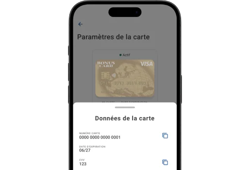 Vous pourrez copier le numéro et le CVV en sélectionnant l'icône bleue à droite.