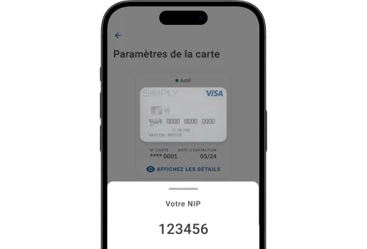 Cliquez sur «Code NIP» dans la section «Cartes» ou dans les paramètres de votre carte, confirmez votre identité avec Face ID ou votre empreinte digitale (vous pouvez aussi utiliser le code de déblocage du téléphone) et vous pourrez visualiser le NIP pendant une durée maximale de 30 secondes.